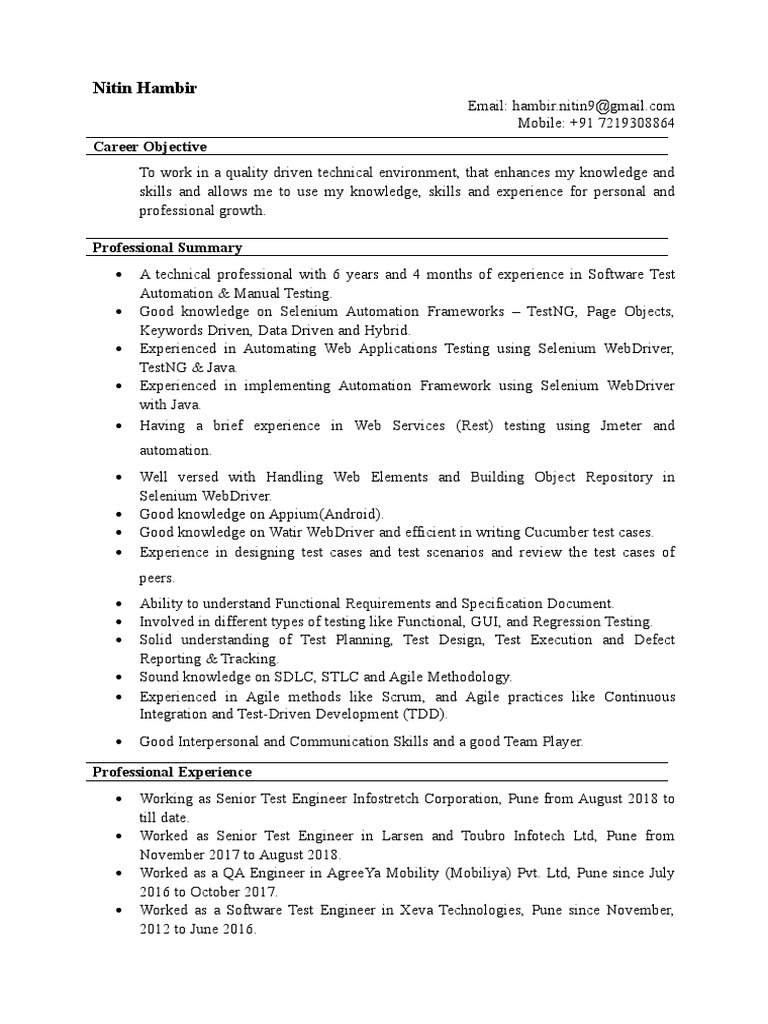 Nitin Hambir Resume Software Testing Selenium Software