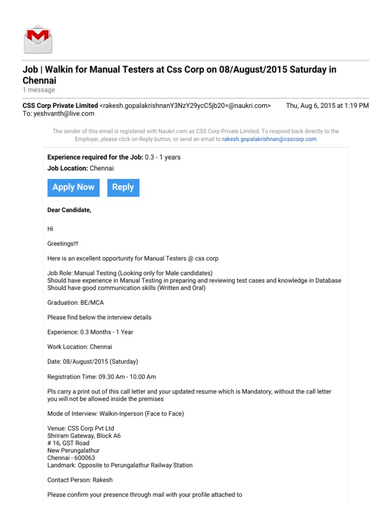 Gmail Job Walkin For Manual Testers At Css Corp On